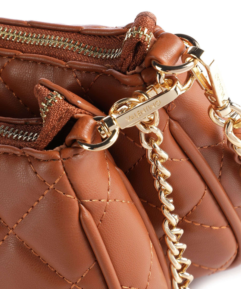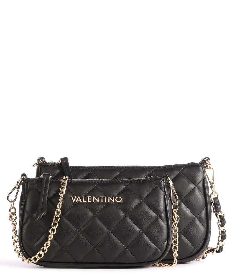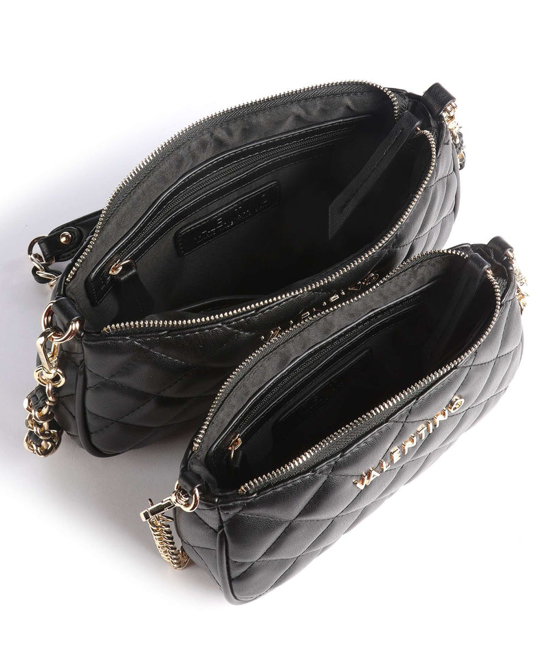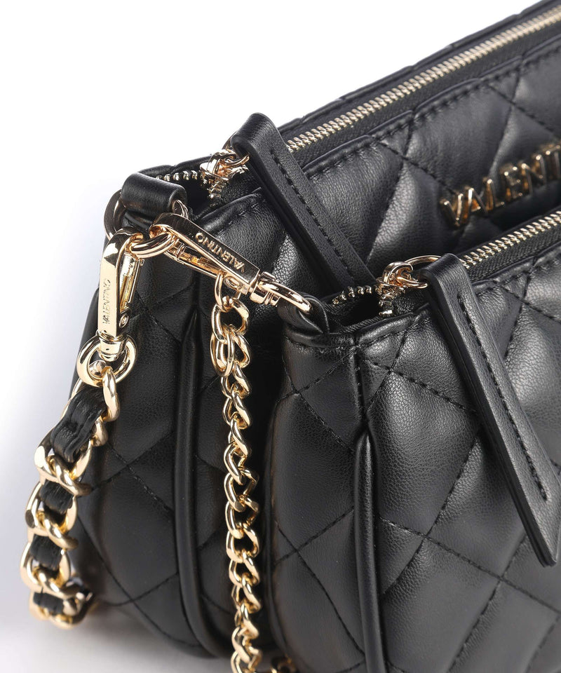 La borsa Ocarina di Valentino Bags è facilmente abbinabile a qualsiasi look .E' realizzata in pelle sintetica con effetto trapuntato. L'originalità di questo modello è che è formata da due borse agganciate fra loro da indossare insieme o singolarmente. Ambedue hanno un comparto principale con zip e tasche interne con zip. Hanno inciso sul fronte il logo del brand in metallo dorato e sono dotate di una tracolla a catena in metallo dorato