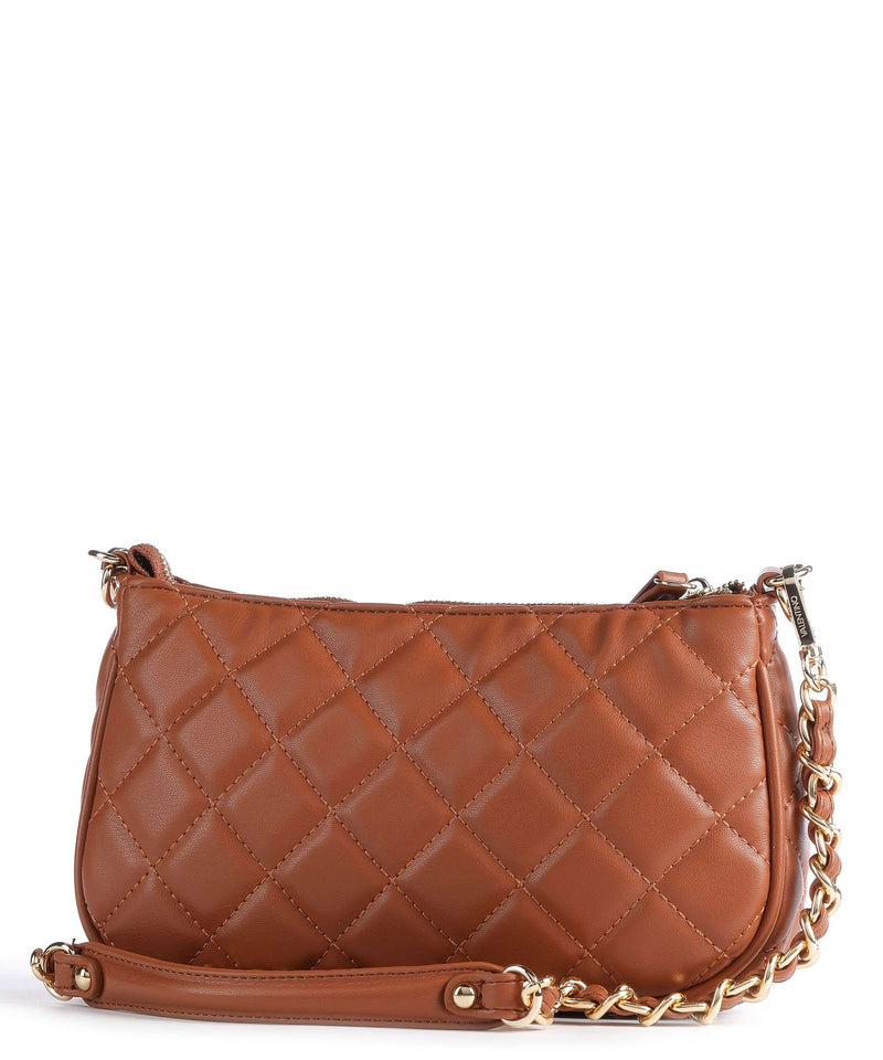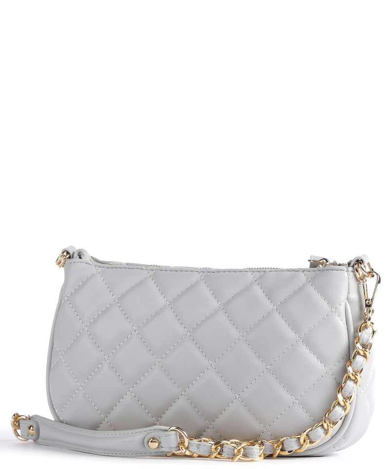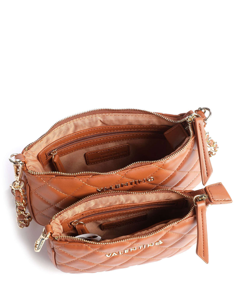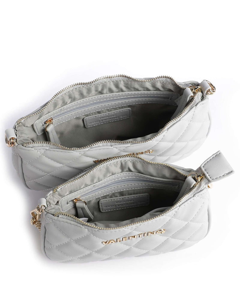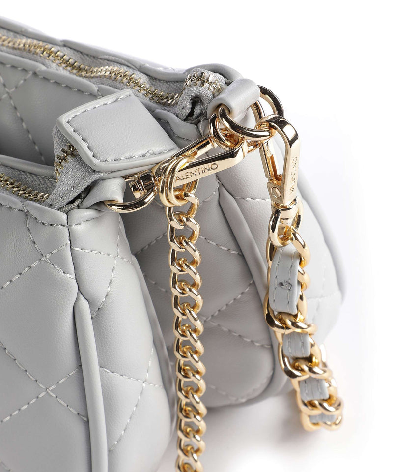 La borsa Ocarina di Valentino Bags è facilmente abbinabile a qualsiasi look .E' realizzata in pelle sintetica con effetto trapuntato. L'originalità di questo modello è che è formata da due borse agganciate fra loro da indossare insieme o singolarmente. Ambedue hanno un comparto principale con zip e tasche interne con zip. Hanno inciso sul fronte il logo del brand in metallo dorato e sono dotate di una tracolla a catena in metallo dorato