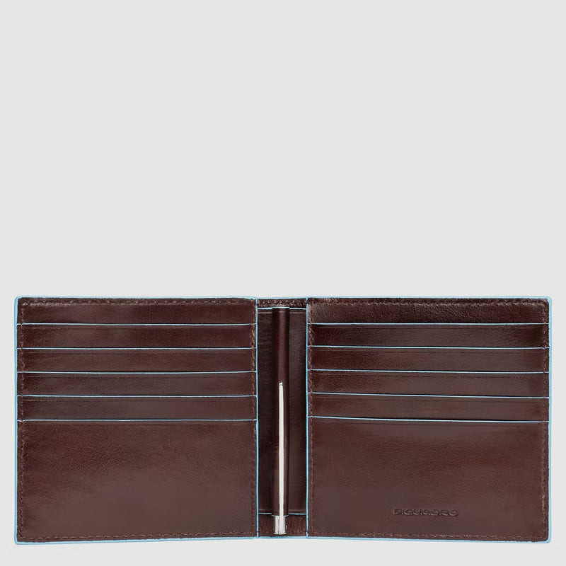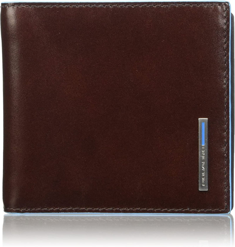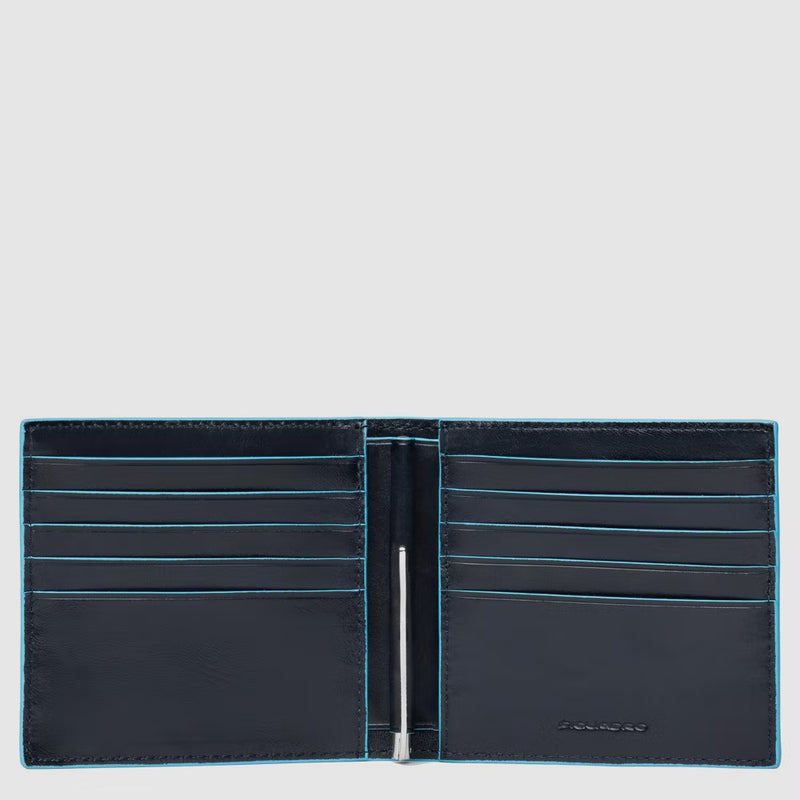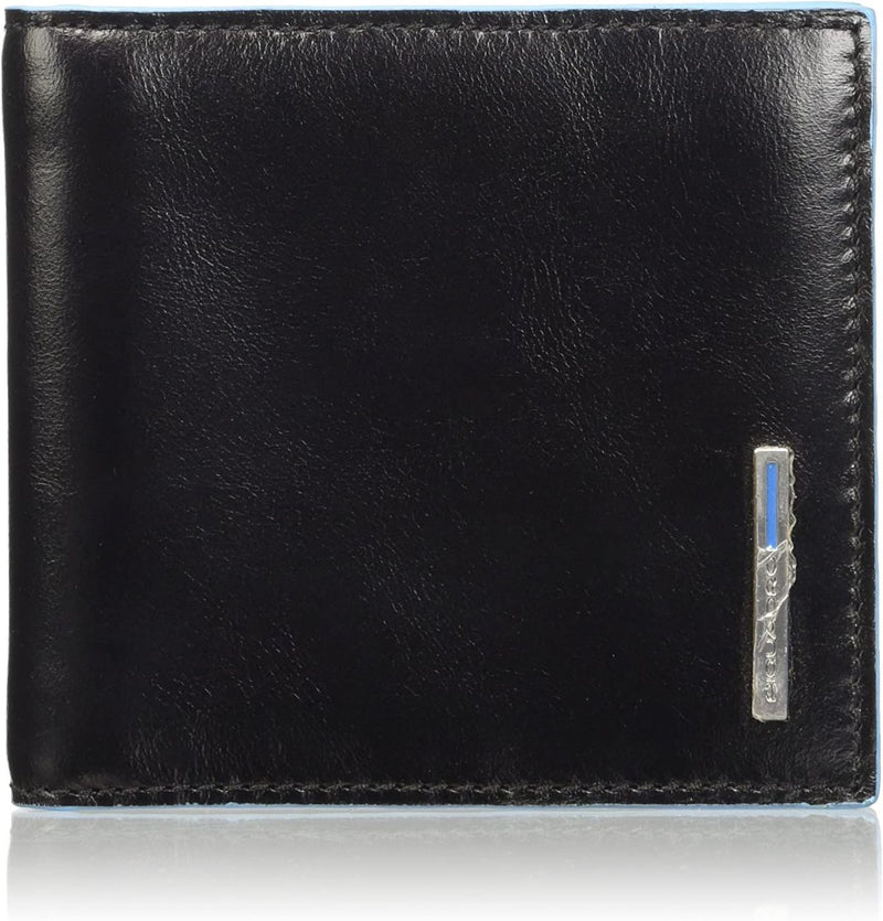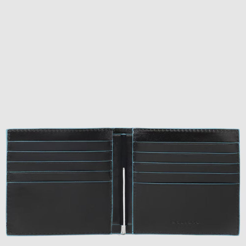 Il portafoglio , porta documenti Blue Square di Piquadro è realizzato in pelle di vitello con conciatura minerale. E' composto da dieci slot porta tessere, una molla porta banconote fissa .I bordi a taglio vivo sono dipinti a mano in azzurro, dandogli un tocco in più e vivacizzando il carattere business. Sulla parte frontale vi è la targhettina della lettering del brand. E' dotato di sistema antifrode  Rfid